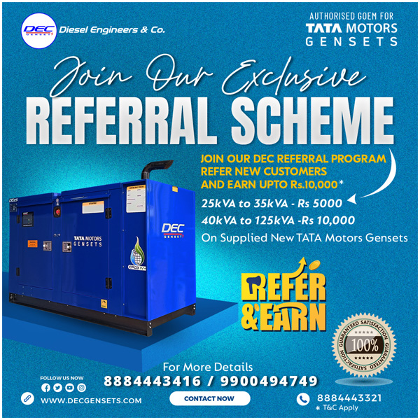 40 to 125KVA - Rs.10,000 for a completed installation of DEC TATA Motors Genset.